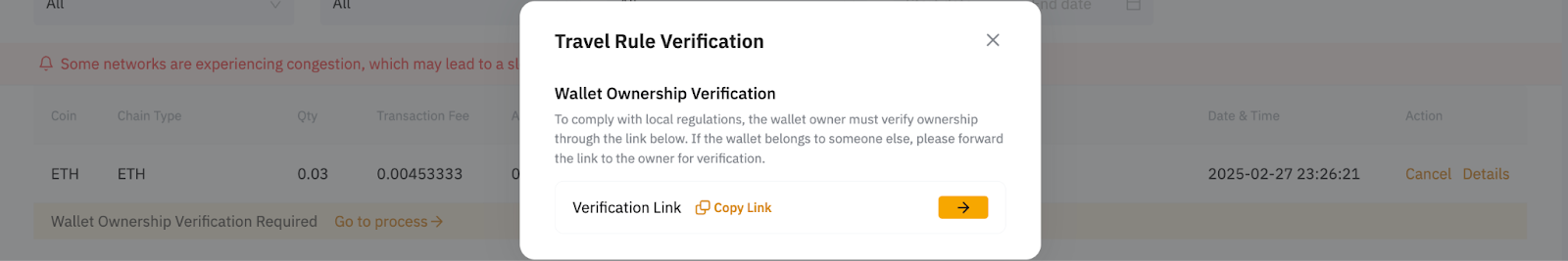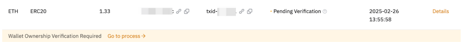 Step 1: Go to your Deposit History, look for the deposit with Wallet Ownership Verification Required, and click on Go to process.