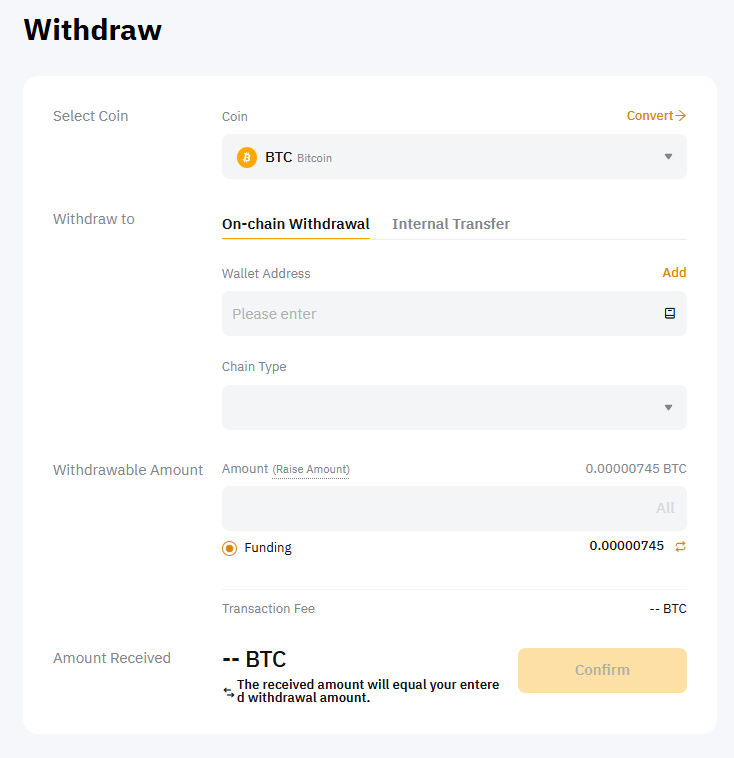 Step 1: Select the coin, address, and chain type for your withdrawal.