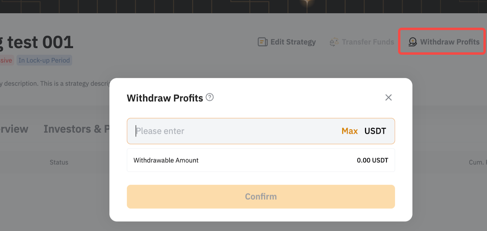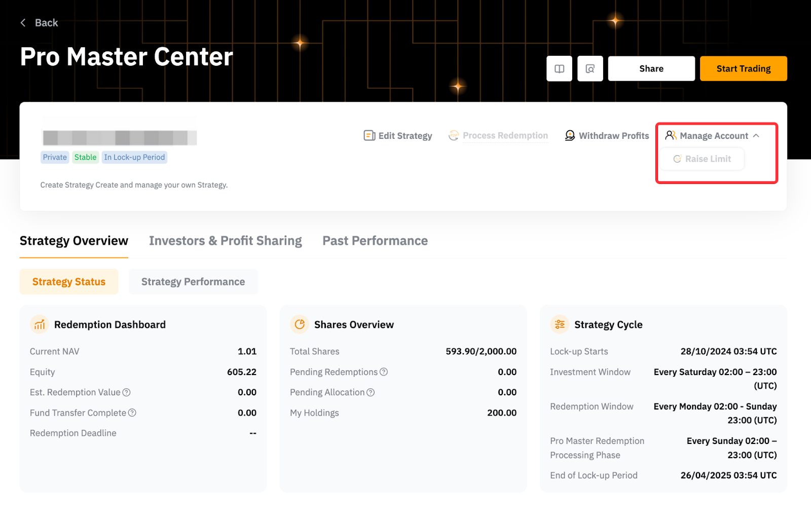 Наприклад, поточний ліміт часток вашої стратегії становить 500 000 часток, а поточний NAV — 1,05. Припустімо, що мін. Основний баланс становить 10%, щоб збільшити ліміт часток до 1 мільйона, ви повинні внести ще 52 500 USDT у свою стратегію [(1 000 000 - 500 000) x 1,05 x 10%].