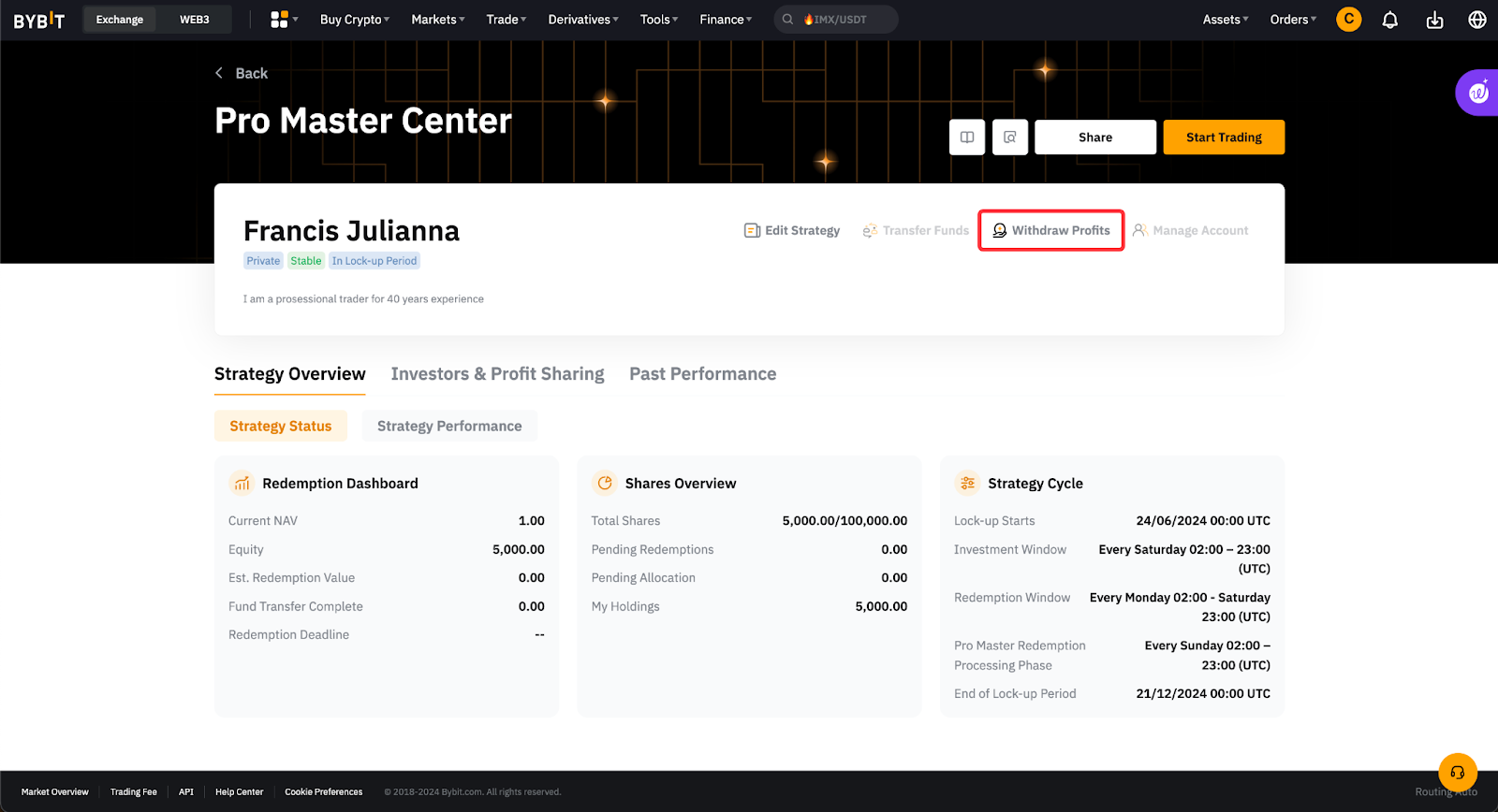 Майстри рівня Pro можуть виводити тільки свою частку прибутку, але не реалізований торговий прибуток. Виведення частки прибутку обмежено на етапах обробки виплат та розрахунків. Для детального пояснення правил розподілу прибутку зверніться до цієї статті.