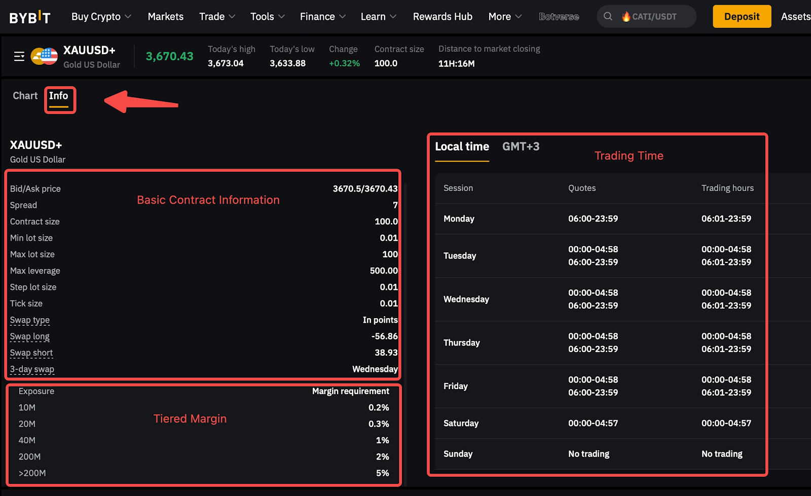 Ви можете переглянути графіки та деталі акаунта безпосередньо на торговій сторінці, та перевірити специфікації договору, натиснувши на значок [Info].