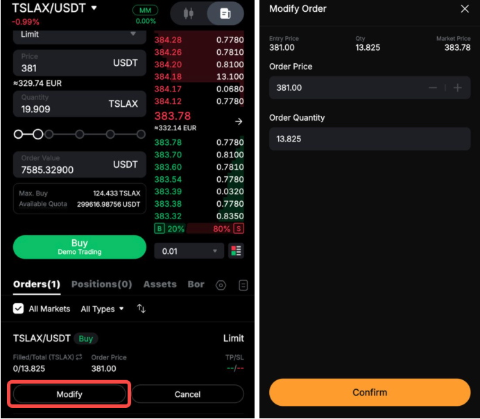 Торкніться Змінити під параметрами ордера, щоб змінити такі деталі, як ціна ордера, ціна активації або кількість в ордері. Ви також можете перемикатися між ціною акції та ціною токена на сторінці зміни ордера та сторінці історії ордерів.