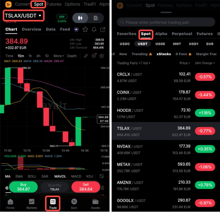 Крок 1: Переконайтеся, що ви перебуваєте на вкладці Спот, і виберіть торгову пару xStocks, якою ви бажаєте торгувати.