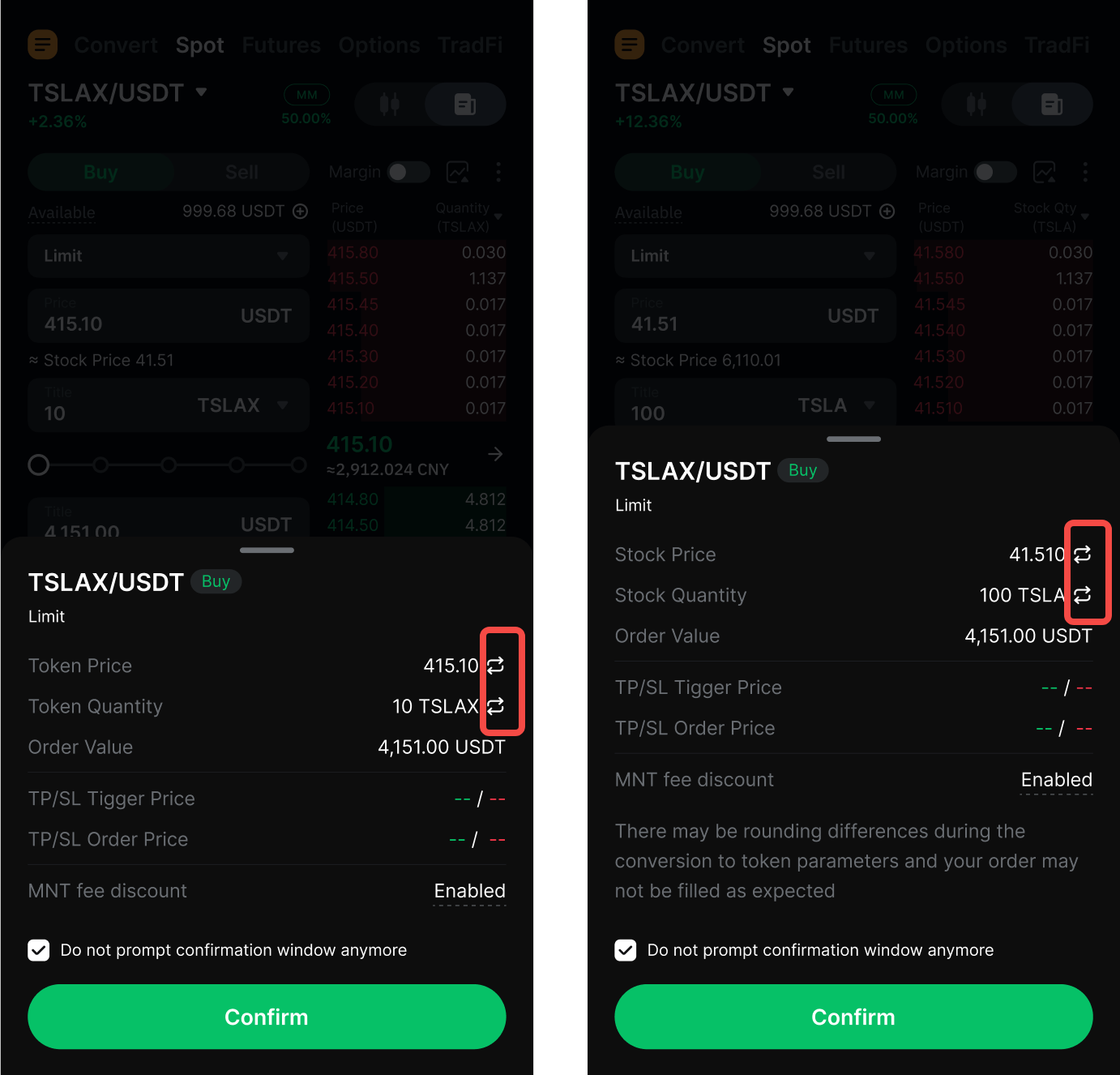 Крок 3: З’явиться вікно підтвердження. Торкніться стрілки поруч із Ціна токена / Ціна акції, щоб за потреби змінити відображення ціни. Перевірте деталі ордера та торкніться Підтвердити.