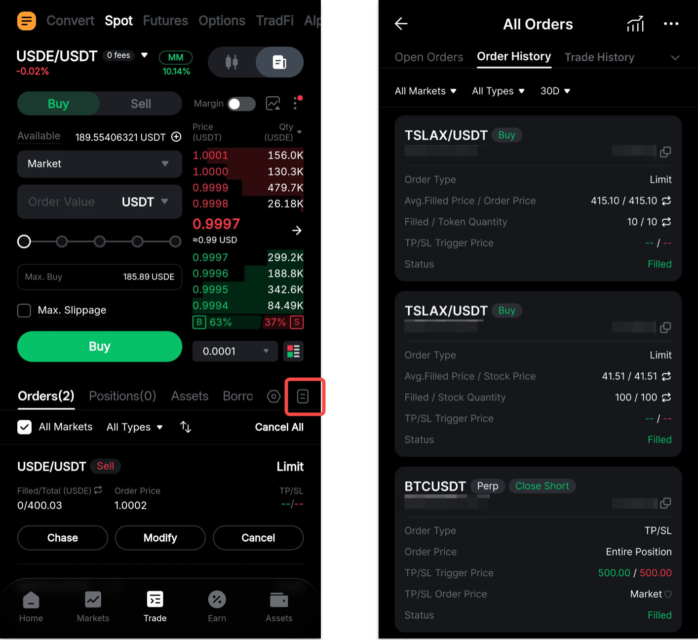 Ви можете переглянути свої поточні невиконані або неактивовані ордери на вкладці Ордери. Щоб переглянути ордери для всіх торгових пар, виберіть Усі ринки.