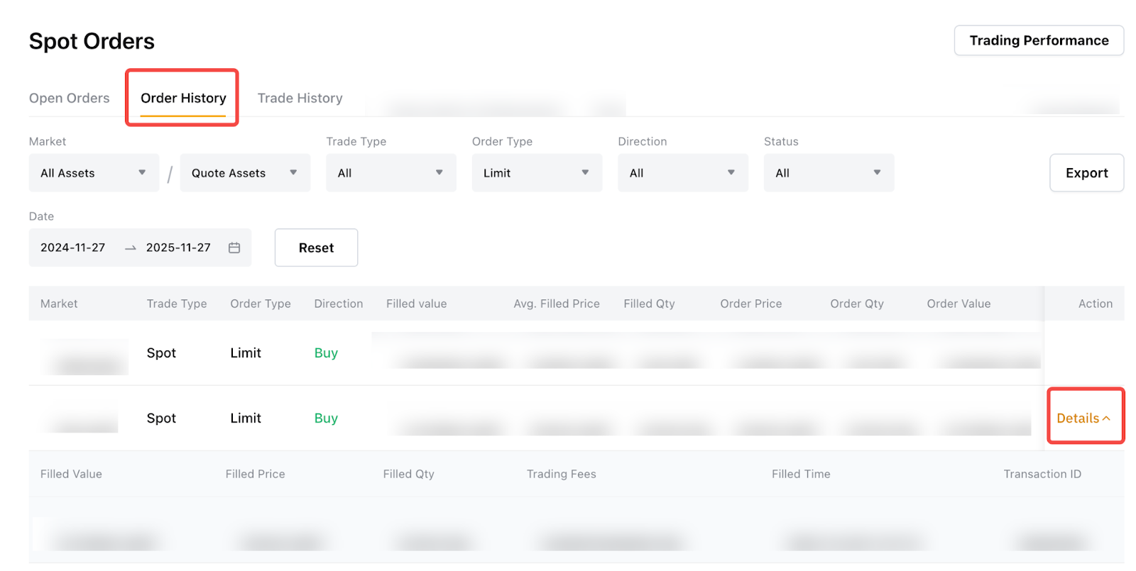 Додаткова інформація, пов’язана з виконанням, зокрема ціна виконання, торгована кількість, вартість виконання, комісія, час виконання та ID/роль трансакції, також доступна в тому самому розділі або її можна переглянути, натиснувши Деталі у стовпці «Дія».
