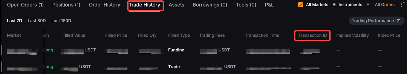 - ID трансакції: Унікальний ідентифікатор для конкретної торгової трансакції. ID трансакції також можна знайти в історії угод.