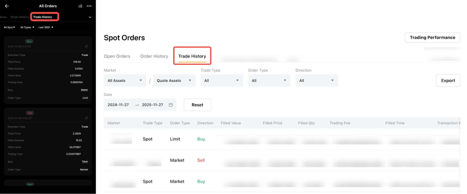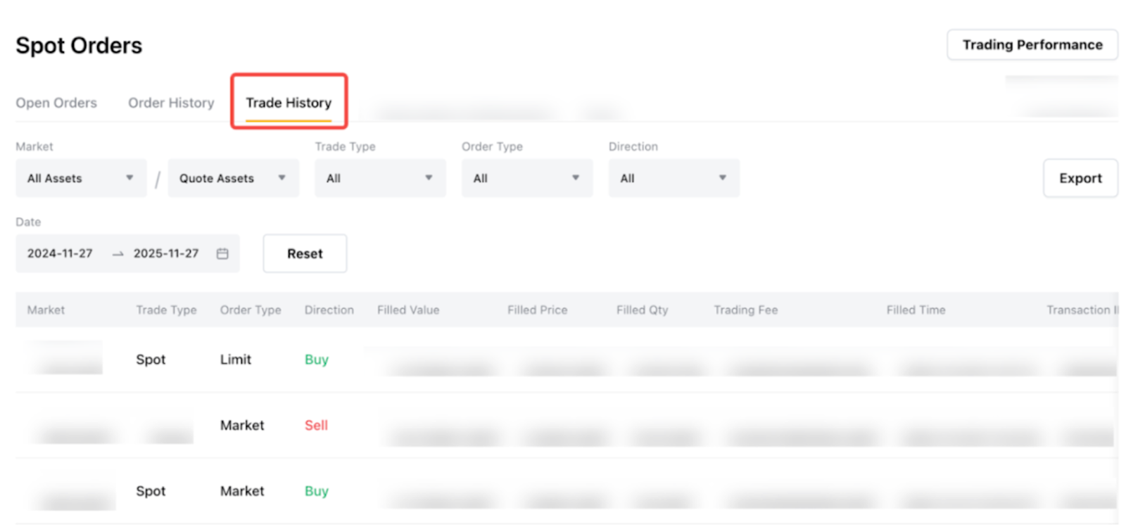 Там ви зможете відфільтрувати записи за ринком (усі активи та котирувані активи), типом угоди, типом ордера, напрямком або статусом, щоб швидко знайти потрібний запис.