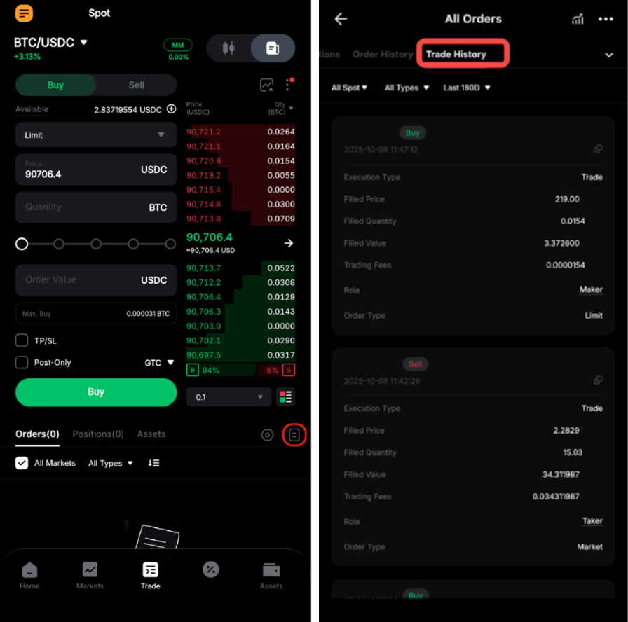 У застосунку: Перейдіть на сторінку «Торгівля» і торкніться значка «Історія» у верхньому правому куті поля позиції, щоб переглянути всі свої записи. Потім виберіть вкладку «Історія угод».