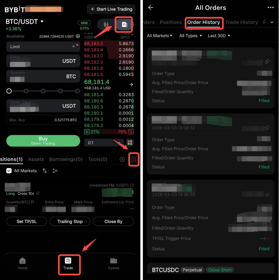 Bybit надає два типи записів про ваші минулі торгові операції: Історія угод та Історія ордерів. Ці функції дозволяють чітко відстежувати всі виконані угоди, скасовані ордери, комісії тощо. Щоразу, коли ви розміщуєте ордер або виконуєте угоду, ви можете легко знайти відповідний запис у цих двох розділах.