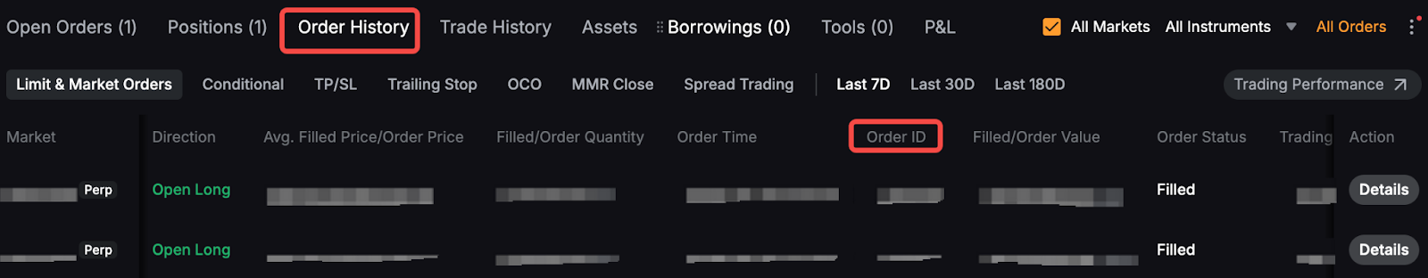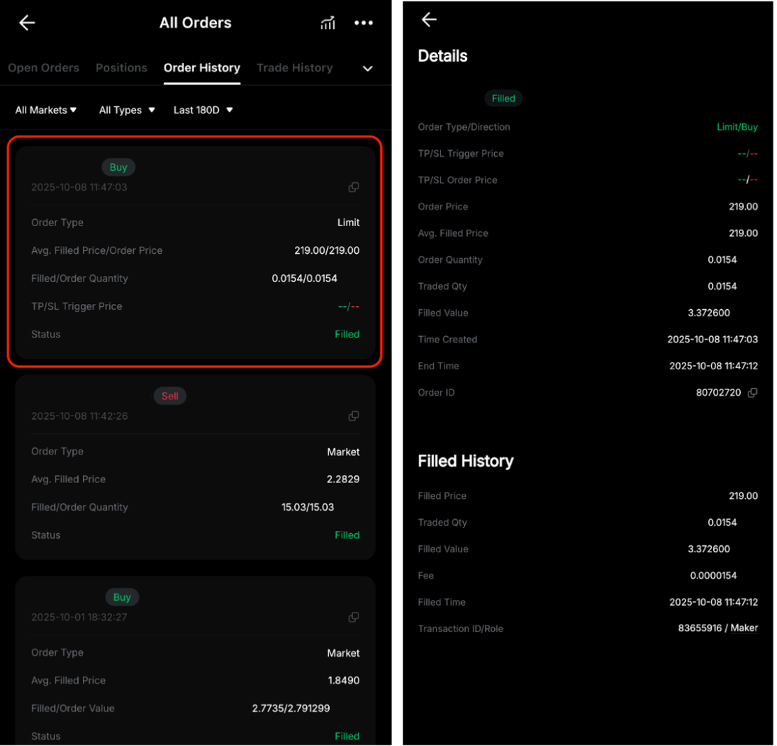 Ваша історія ордерів фіксує все, що відбувається з вашими ордерами — чи вони виконані, частково виконані, невиконані або скасовані. При перегляді історії ордерів кожному запису буде присвоєно ідентифікатор ордера (Order ID). Це унікальний ідентифікатор для кожного ордера, розміщеного трейдером.