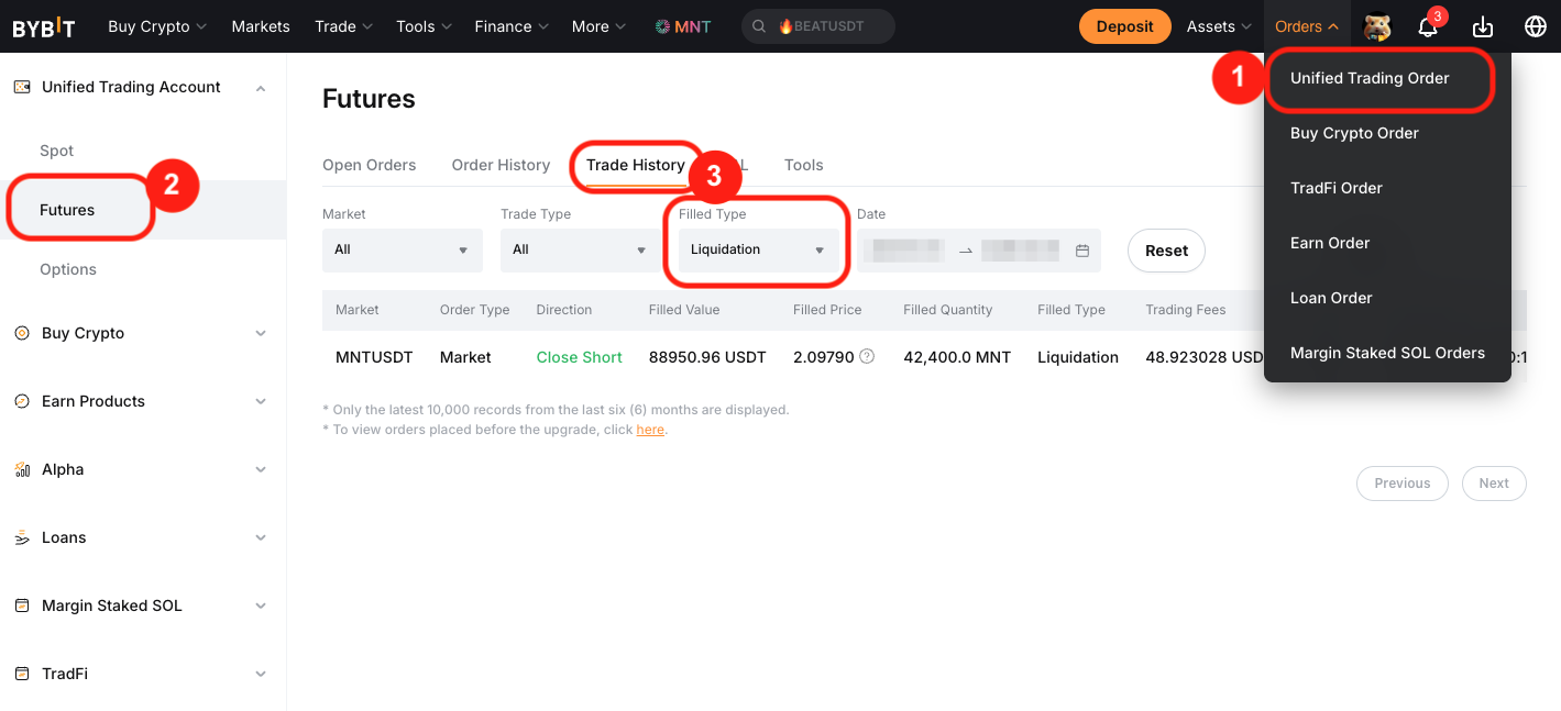 Trên trang web, đi tới lệnh trên thanh điều hướng trên cùng và chọn Unified Trading Order. Trong bảng điều khiển bên trái, nhấp vào Hợp đồng Tương lai, sau đó mở tab lịch sử giao dịch và chọn Thanh lý từ bộ lọc Loại đã khớp.