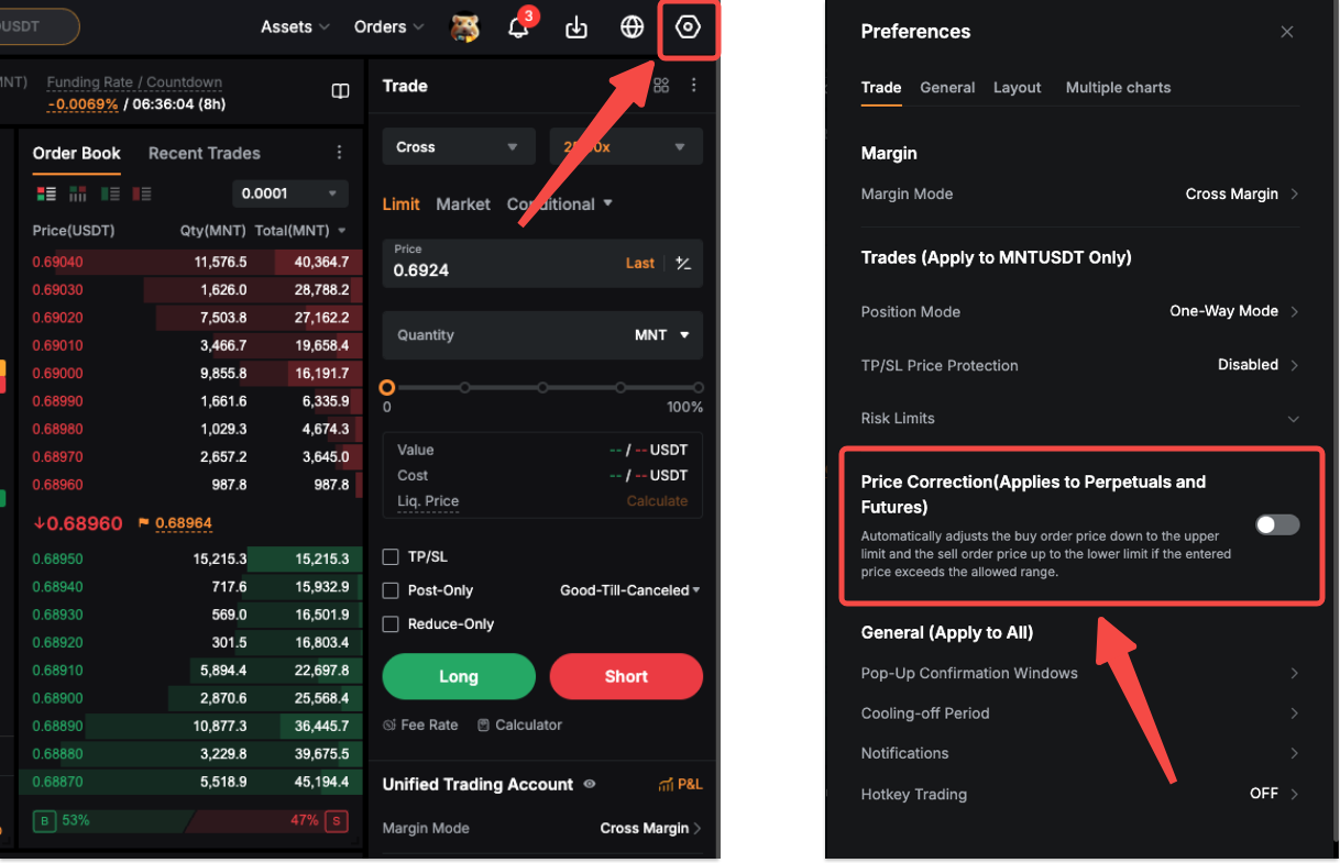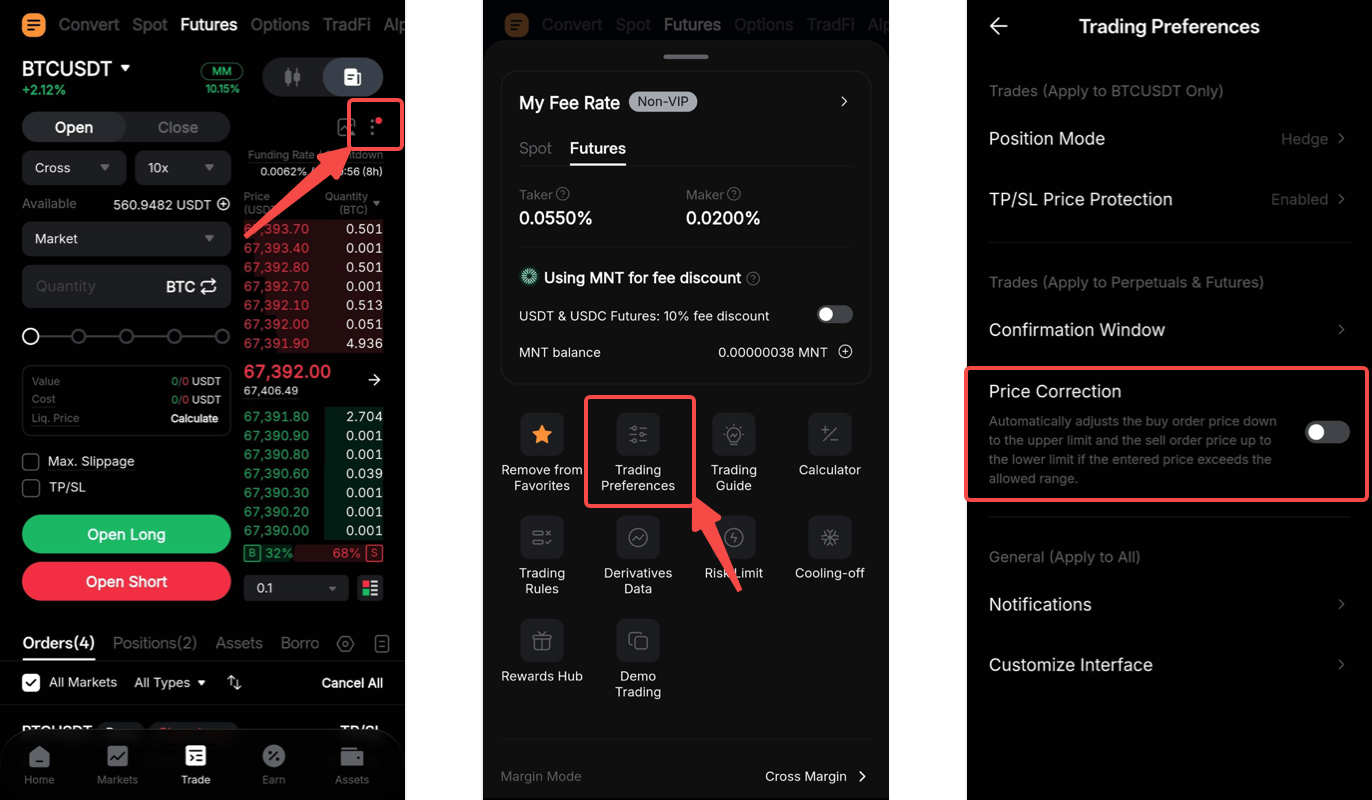Trên Ứng dụng Bybit, hãy truy cập trang giao dịch, nhấn vào biểu tượng dấu ba chấm ở góc trên cùng bên phải của sổ lệnh và chọn ưu tiên giao dịch. Sau đó, tìm Hiệu chỉnh giá và bật tính năng này lên.