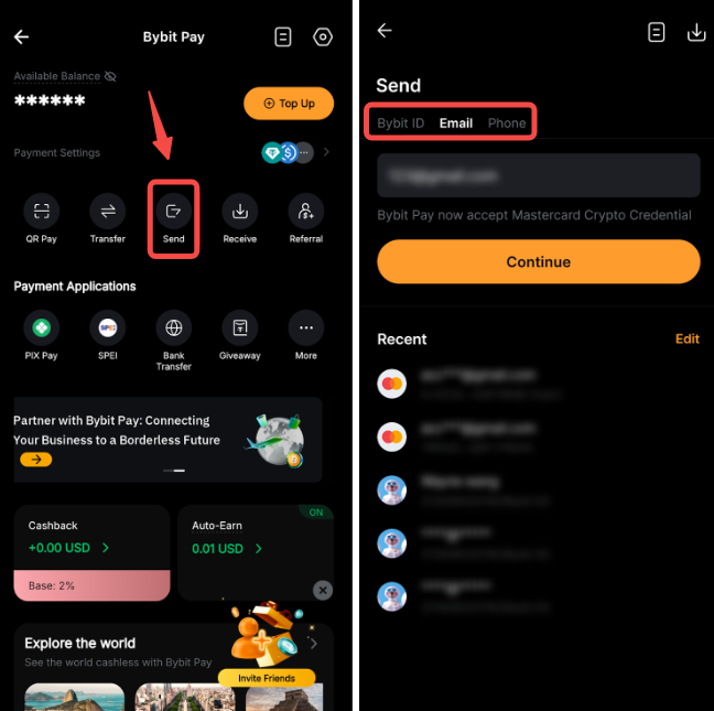 Bước 1: Nhấn vào Gửi từ trang Bybit Pay và chọn gửi qua ID, Email hoặc Số Điện Thoại của Bybit.