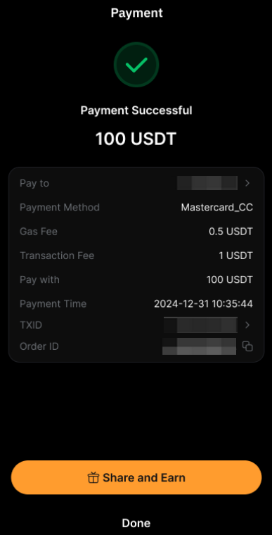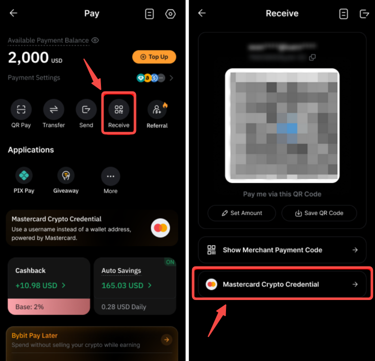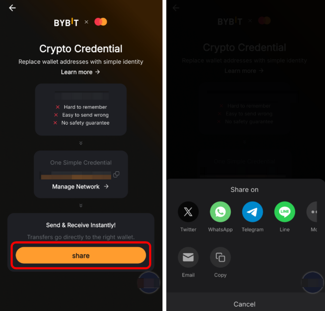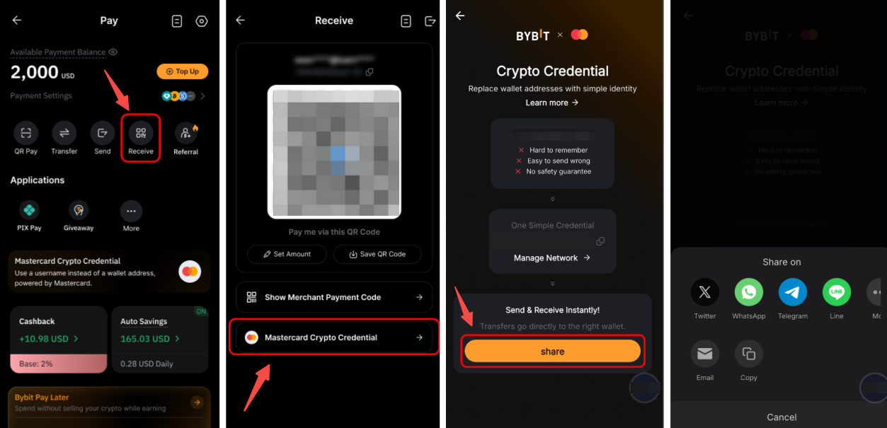 Nhấn vào Nhận trên trang Bybit Pay, sau đó nhấn vào Thông Tin Đăng Nhập Crypto Mastercard. Nhấn vào Chia Sẻ để chia sẻ yêu cầu nhận của bạn trên mạng xã hội hoặc gửi dưới dạng liên kết đến người gửi.
