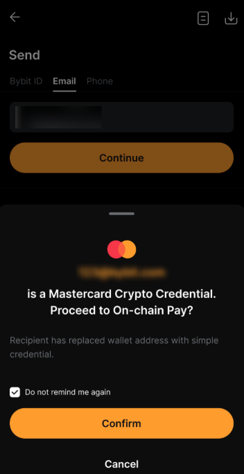 - Nếu người nhận của bạn là người dùng Bybit, tài sản sẽ chỉ được gửi qua Chuyển Khoản Nội Bộ, cho dù họ có tài khoản Thông Tin Đăng Nhập Crypto Mastercard hay không.