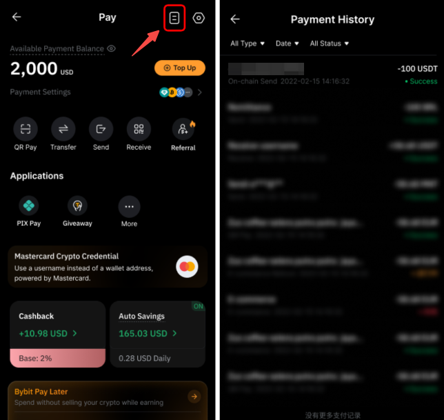 Khám Phá cập trang Thanh Bybit Pay và nhấn vào biểu tượng Lịch sử thanh toán nằm ở góc trên bên phải.