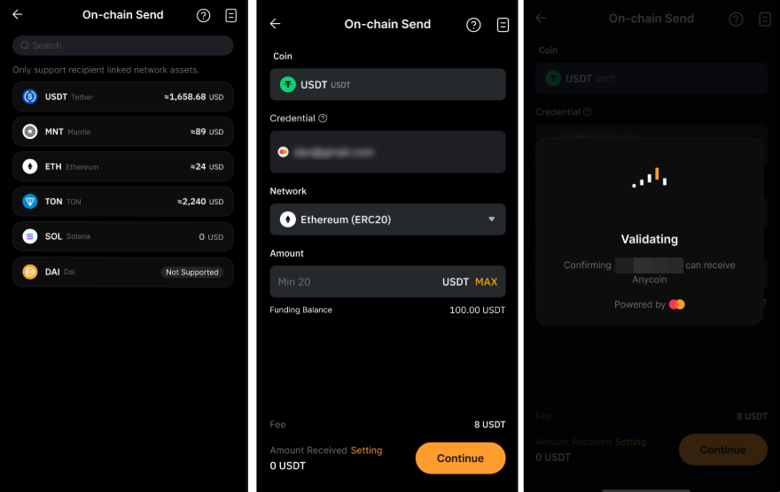 - Chỉ hiển thị danh sách các loại tiền điện tử và mạng lưới được hỗ trợ trên Thông Tin Đăng Nhập Mastercard Crypto của người nhận.