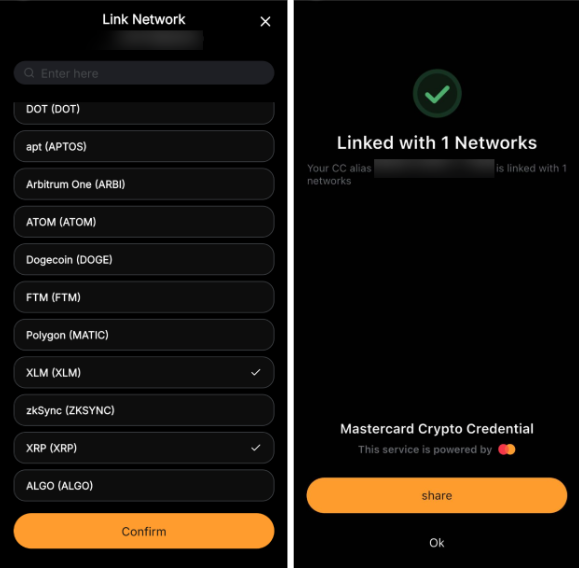 Bước 3: Nhập tên mạng vào thanh tìm kiếm, chọn mạng mong muốn, sau đó nhấn Xác Xác Nhận để liên kết với Thông Tin Đăng Nhập Crypto Mastercard của bạn.