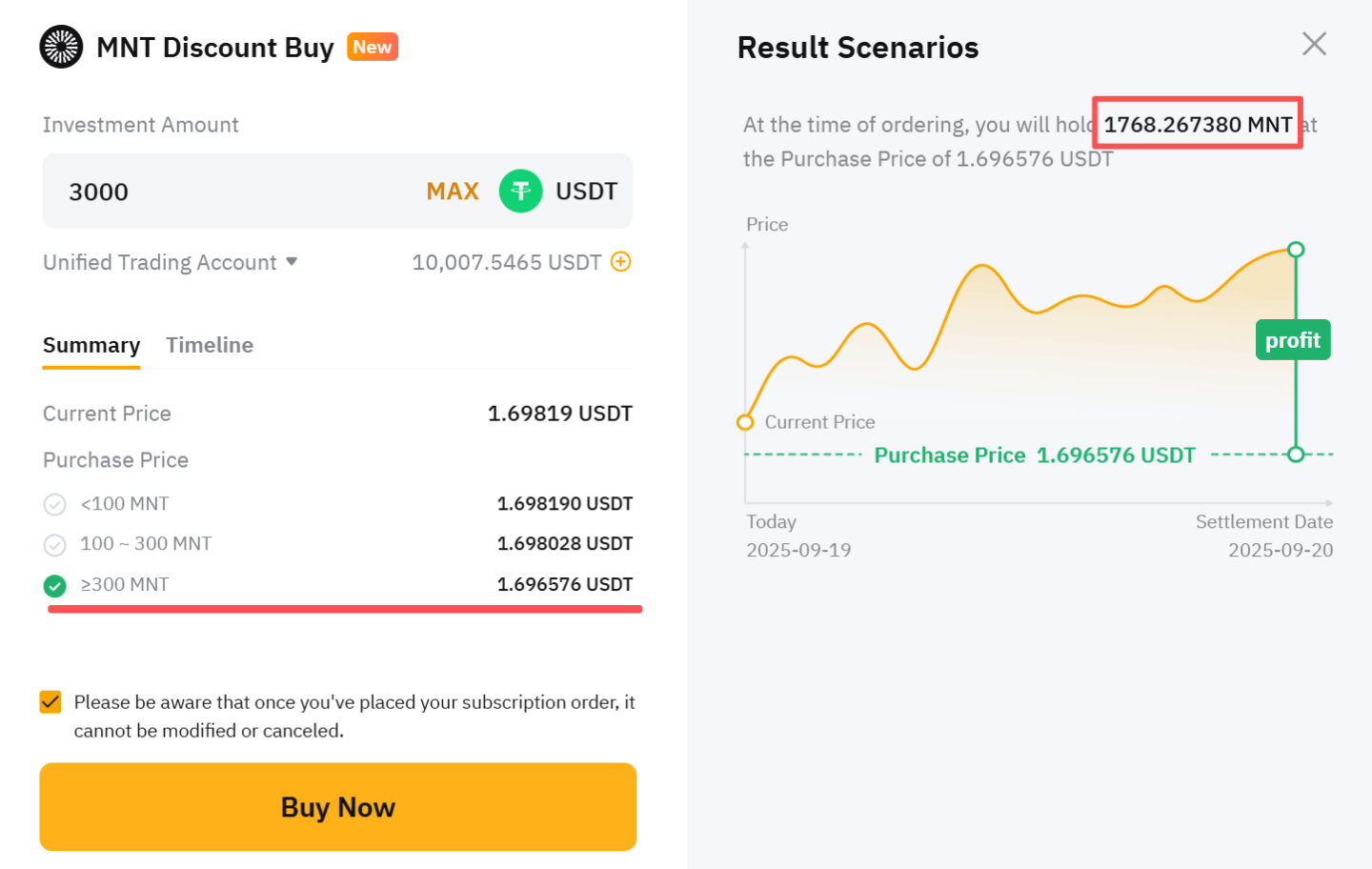 Bất kể Giá Thanh Toán, Trader B sẽ mua MNT ở mức 1,696576 USDT vào ngày thanh toán, nhận được khoảng 1.768.267380 MNT (3.000 ÷ 1,696576). Trader B sẽ được hưởng tất cả lợi ích của MNT từ 1.768.267380 MNT ngay khi đăng ký. Các tài sản MNT sẽ có sẵn để sử dụng sau thời gian khóa 1 ngày.