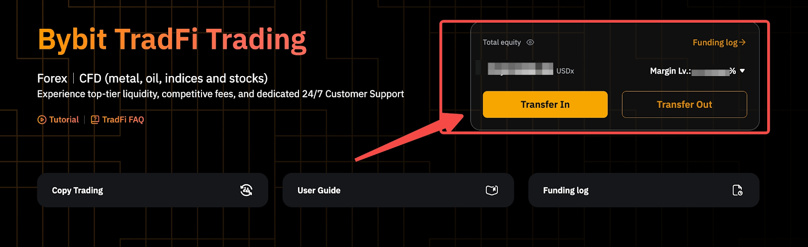 第 2 步: 在 Bybit TradFi 交易页面上,单击转入按钮将资金转入您的 TradFi 账户。