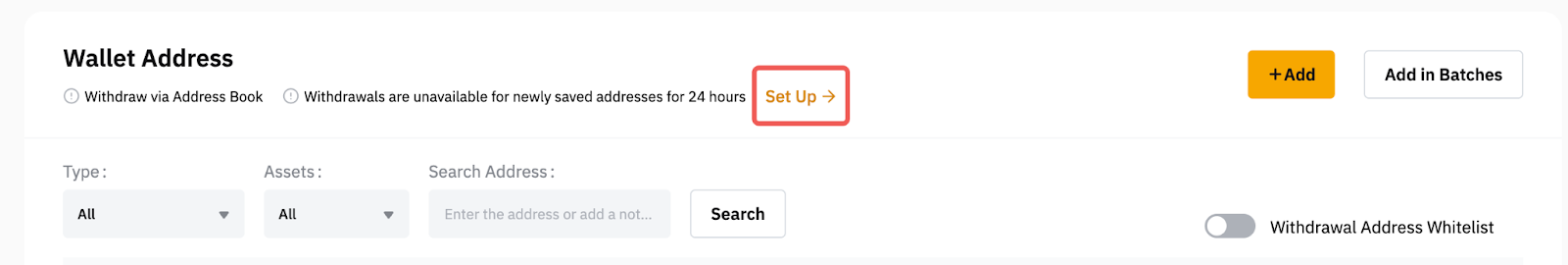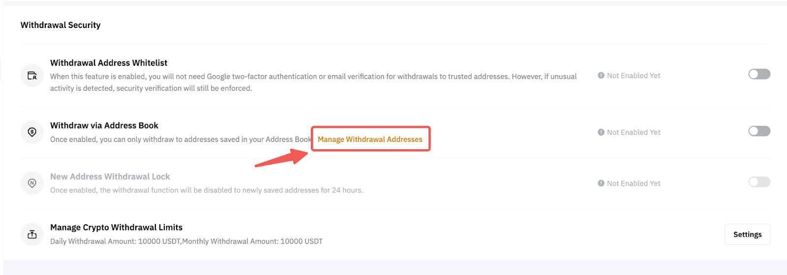 点击设置按钮,即可通过提币地址管理页面访问和修改提币设置。然后,系统会带您回到账户页面上的安全设置页面,您可以在其中切换要启用或禁用仅地址簿提币的选项。