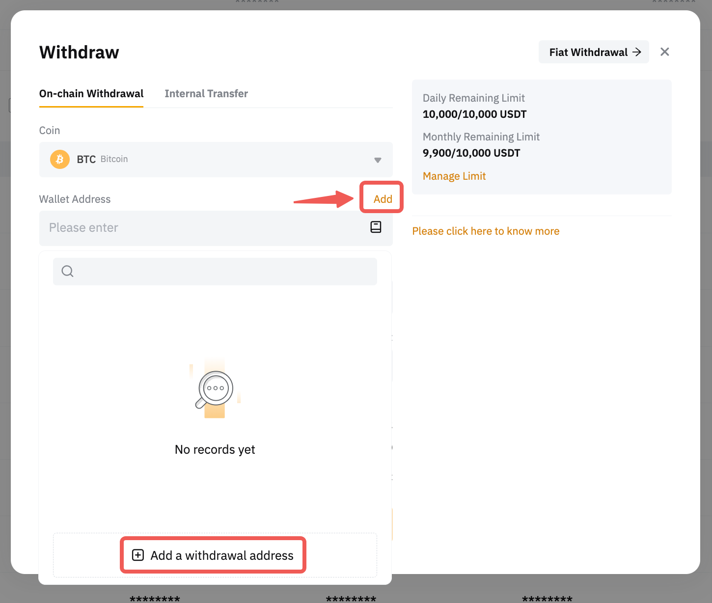 b. 如果您在资金资产页面上,点击提现后,提现窗口将弹出。请点击添加提币地址按钮,跳转至提币地址管理页面。