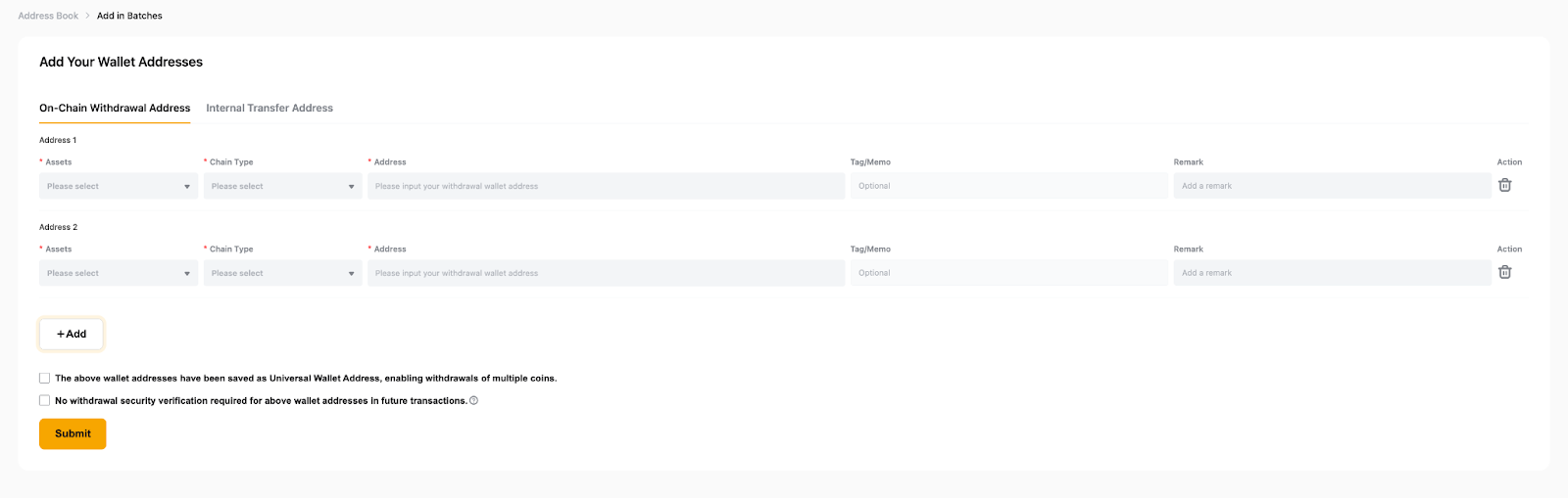 如果您想为链上提款地址和内部转账地址批量添加钱包地址,请注意以下事项: