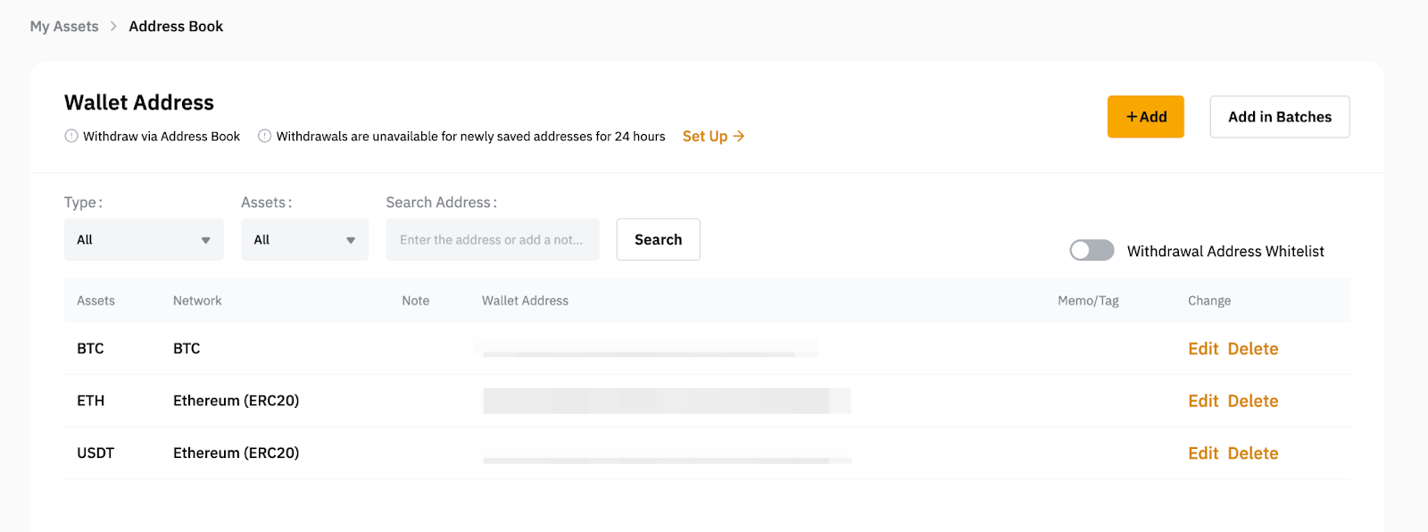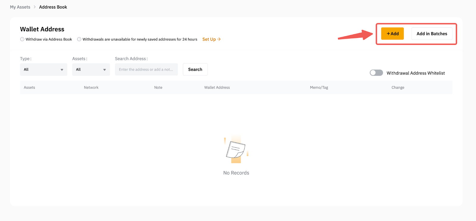 a. 进入提币地址管理页面后,请点击页面右上角的添加按钮添加新钱包地址。如需同时添加多个地址,请点击批量新增地址。