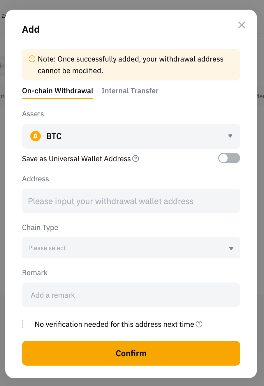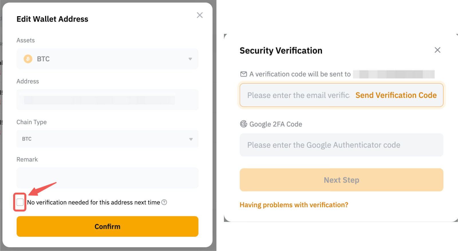 - 如果要启用另存为通用钱包地址或下次不需要验证该地址功能,请选中下面的框。但是,请注意,如果在您的帐户中检测到任何异常活动,也可能需要进行安全验证。