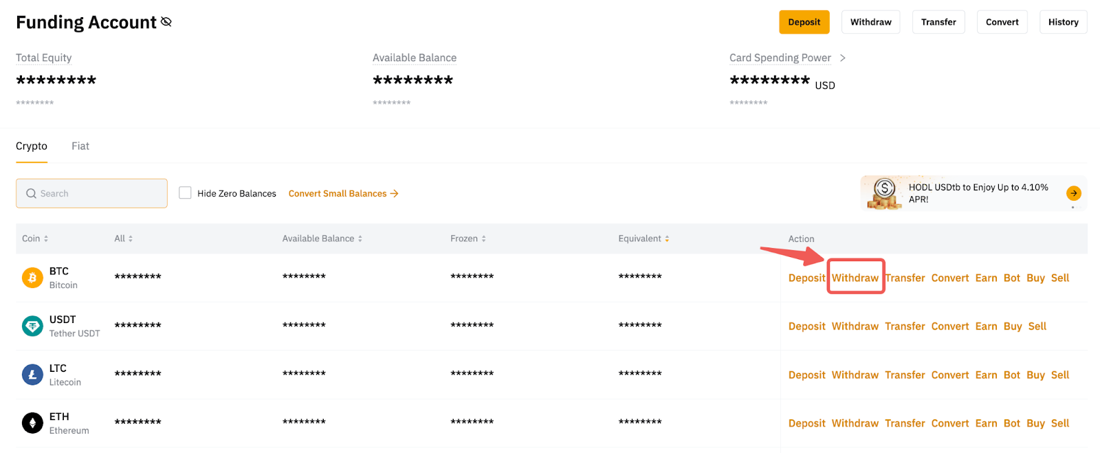 或者,您也可以点击主页右上角的资产,前往资金账户。然后,点击您希望为其添加钱包地址的代币栏中的提现。