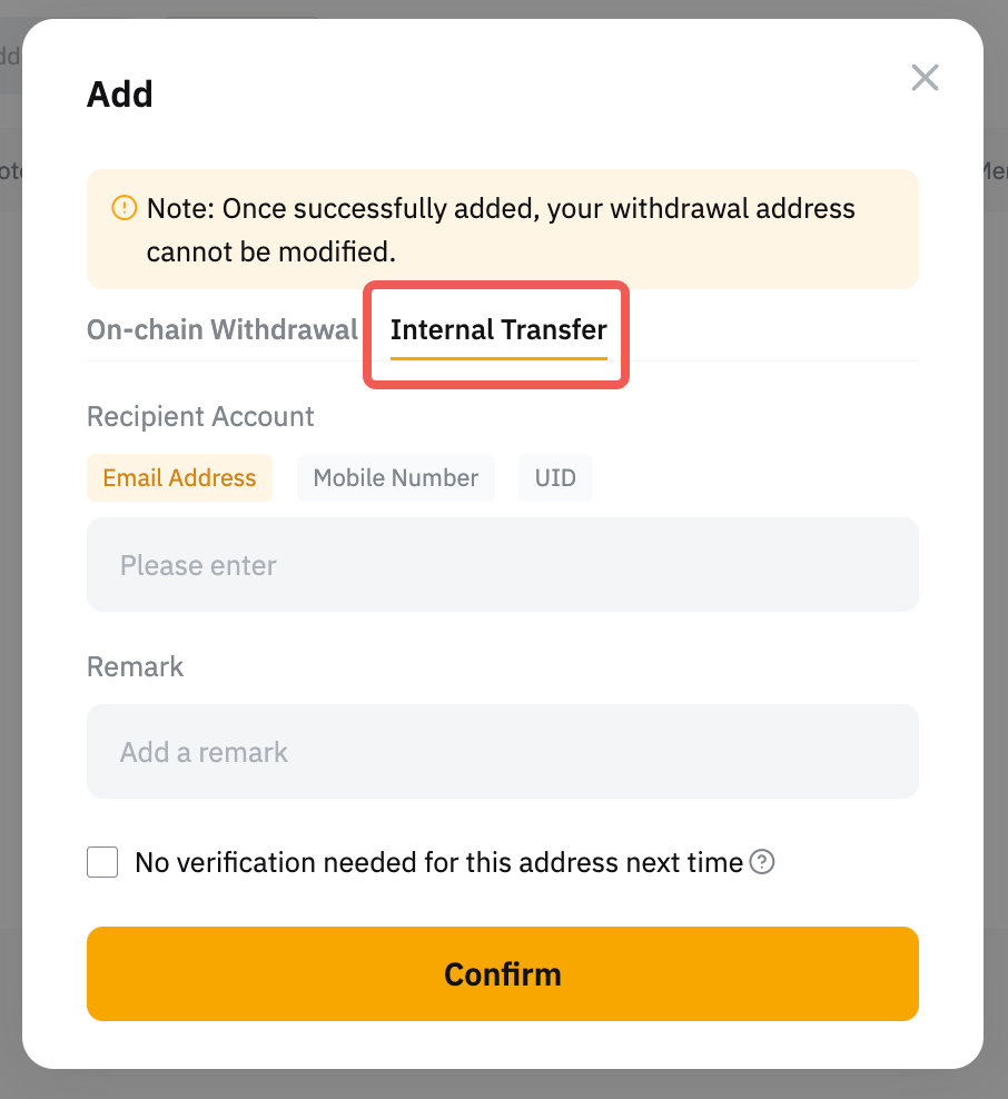 如需添加内部划转账户,只需输入要提币的 Bybit 账户的电子邮件地址、手机号或 UID。