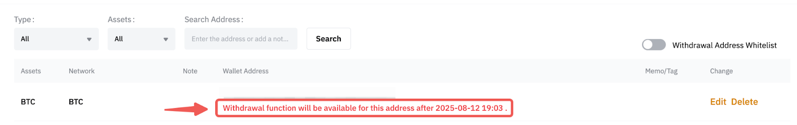 例如,如果您启用了新增地址提币限制安全功能,则新保存地址的提币功能将被限制24 小时,禁用此功能后也会触发24 小时限制。