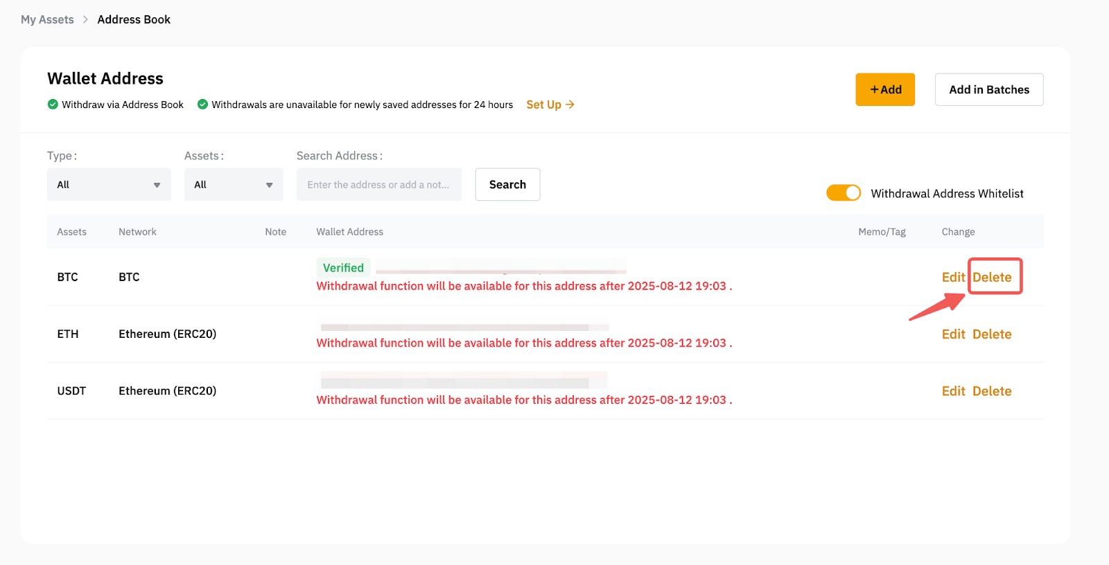 删除提币地址