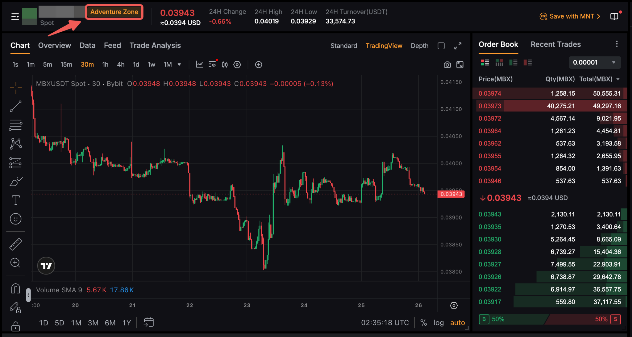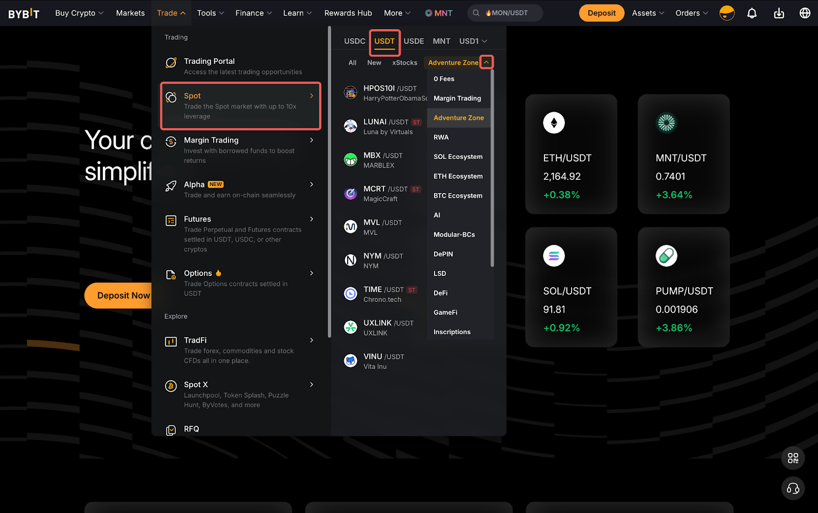若要訪問風險投資區及其交易對,只需點擊交易 → 現貨,並在 USDT 下方的下拉式選單中,選擇風險投資區。