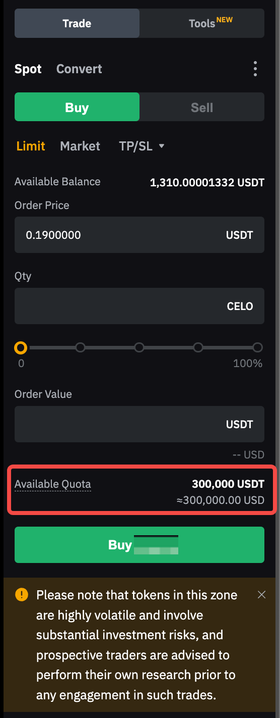 該信息可於交易頁面上的「可用額度」部分查看。例如,若代幣 ABC 的可用額度為 300,000 USDT,單價為 0.5 USDT,則您至多可持有 600,000 ABC(計算公式為 300,000 USDT ÷ 0.5 USDT = 600,000)。