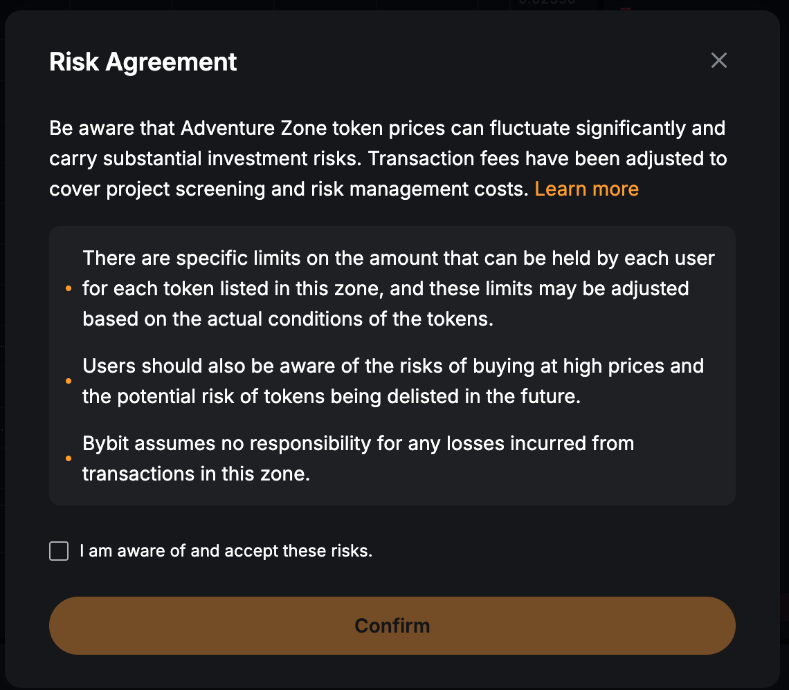 - 下架風險:若風險投資區項目風險過大,Bybit 有權將其下架。而一旦下架,您的交易機會有可能受限。